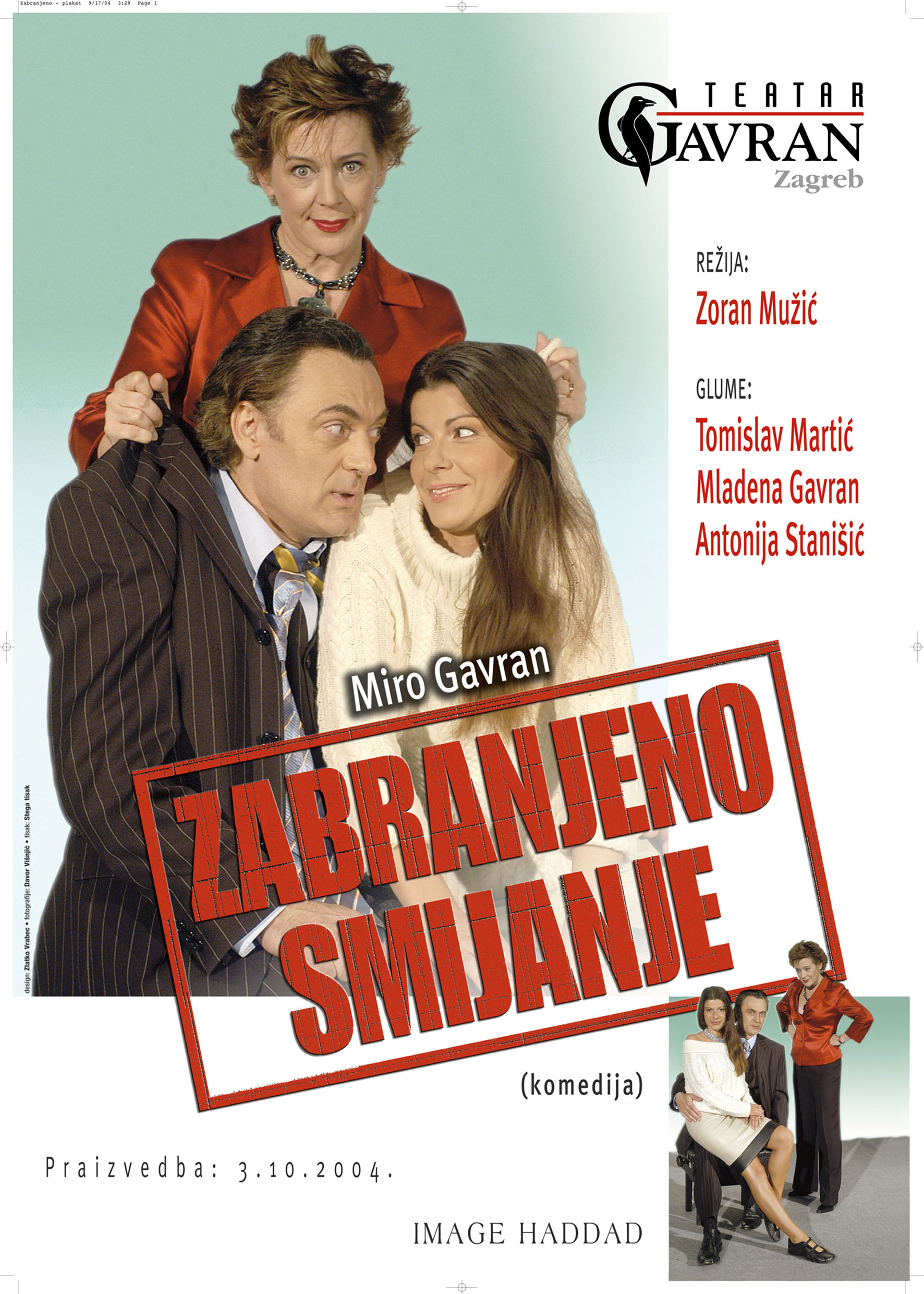 Razotkrivajući mane i vrline prepoznatljivih simpatičnih junaka čija se sudbina otela iz njihovih ruku, predstava “Zabranjeno smijanje” obiluje brojnim iznenađenjima koja iz scene u scenu, u furioznom tempu, vode gledatelja kroz neobičnu priču. U središtu su radnje muž, žena i ljubavnica čije se sudbine toliko isprepletu i zakompliciraju da više ne znaju je li im lakše i ugodnije u tom trokutu ili izvan njega. Autor je za ovu komediju 2004. godine primio Nagradu “Marin Držić” koju dodjeljuje Ministarstvo kulture i medija Republike Hrvatske.